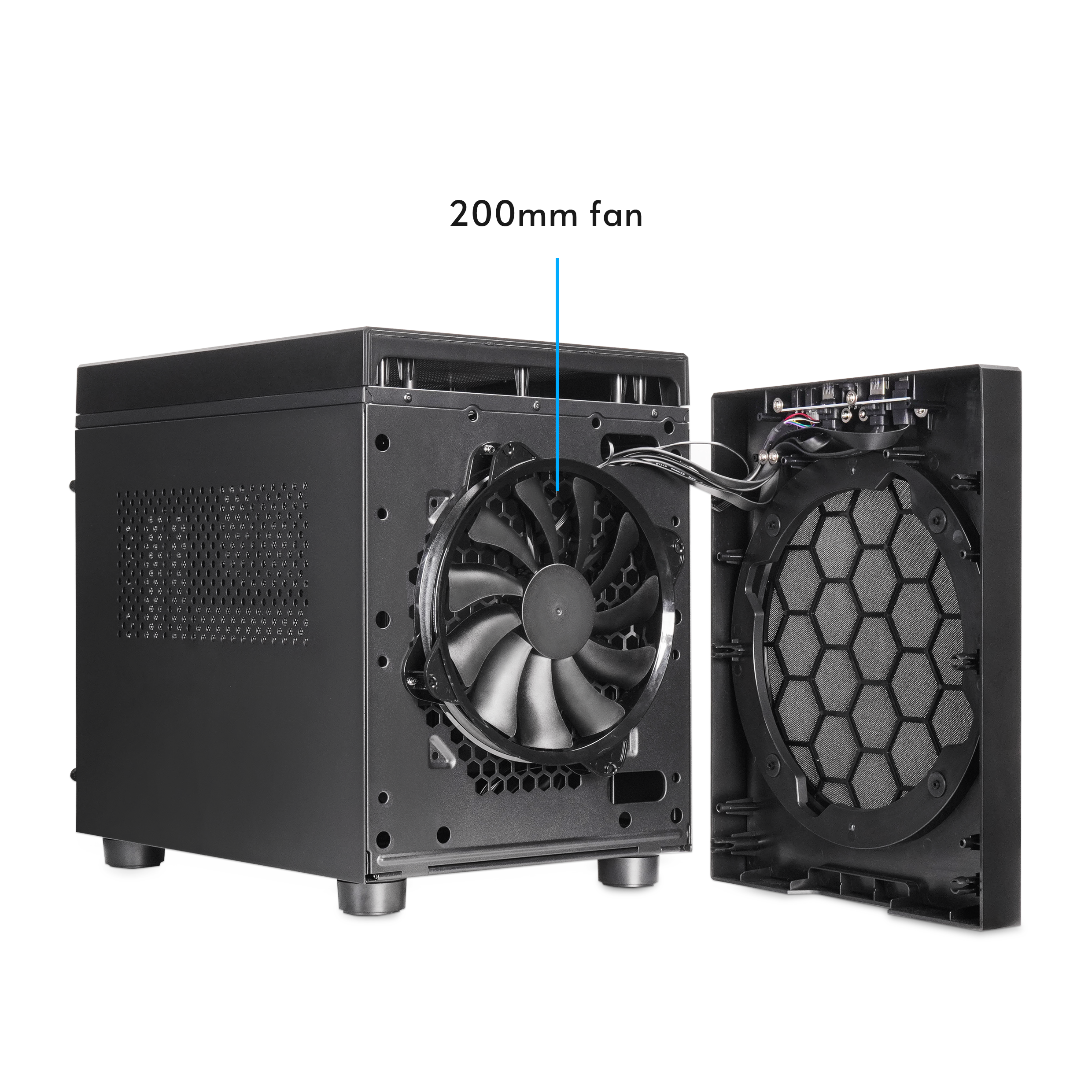 варианты: установка вентиляторов 200 мм спереди и сверху либо радиатора 240 мм. На передней панели уже установлен 200 мм PWM-вентилятор с долговечным подшипником HDB, обеспечивающий тихую работу. Передняя часть корпуса имеет уникальную круглую вентиляционную решетку с дышащей тканью, предназначенную для вентилятора диаметром 200 мм.